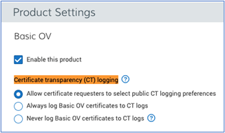 On the Product Settings page, we will remove the Certificate Transparency (CT) logging options for all DigiCert public TLS certificates.