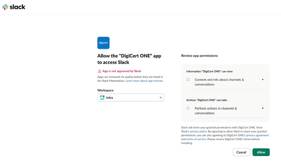- Choose the Slack workspace where you want to install the DigiCert ONE app.