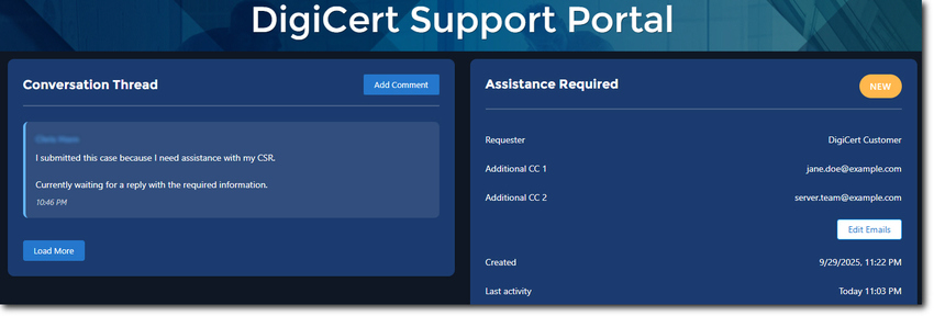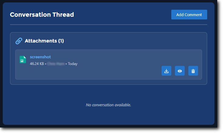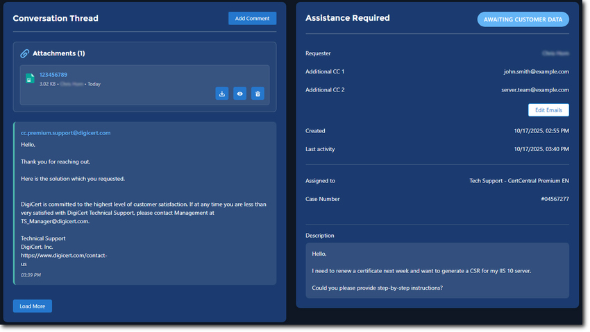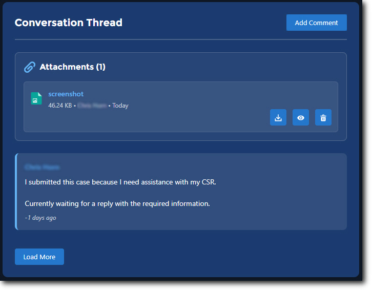 Your comment will be displayed in the Conversation Thread beneath any attachments which were included in the case. If you have added more than one comment, you can view all of the comments by clicking on Load More.