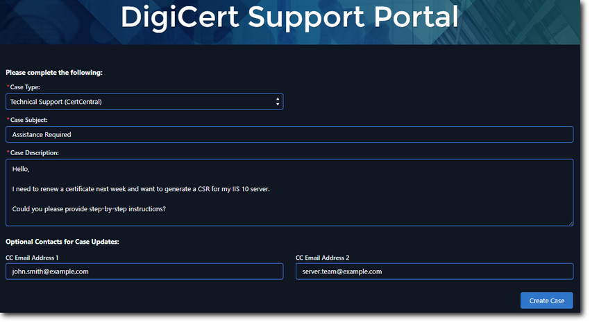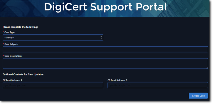 You can include additional contacts on the case who will also receive notifications whenever the case is updated. To do this, enter the contacts’ e-mail addresses into the respective CC Email Address fields.